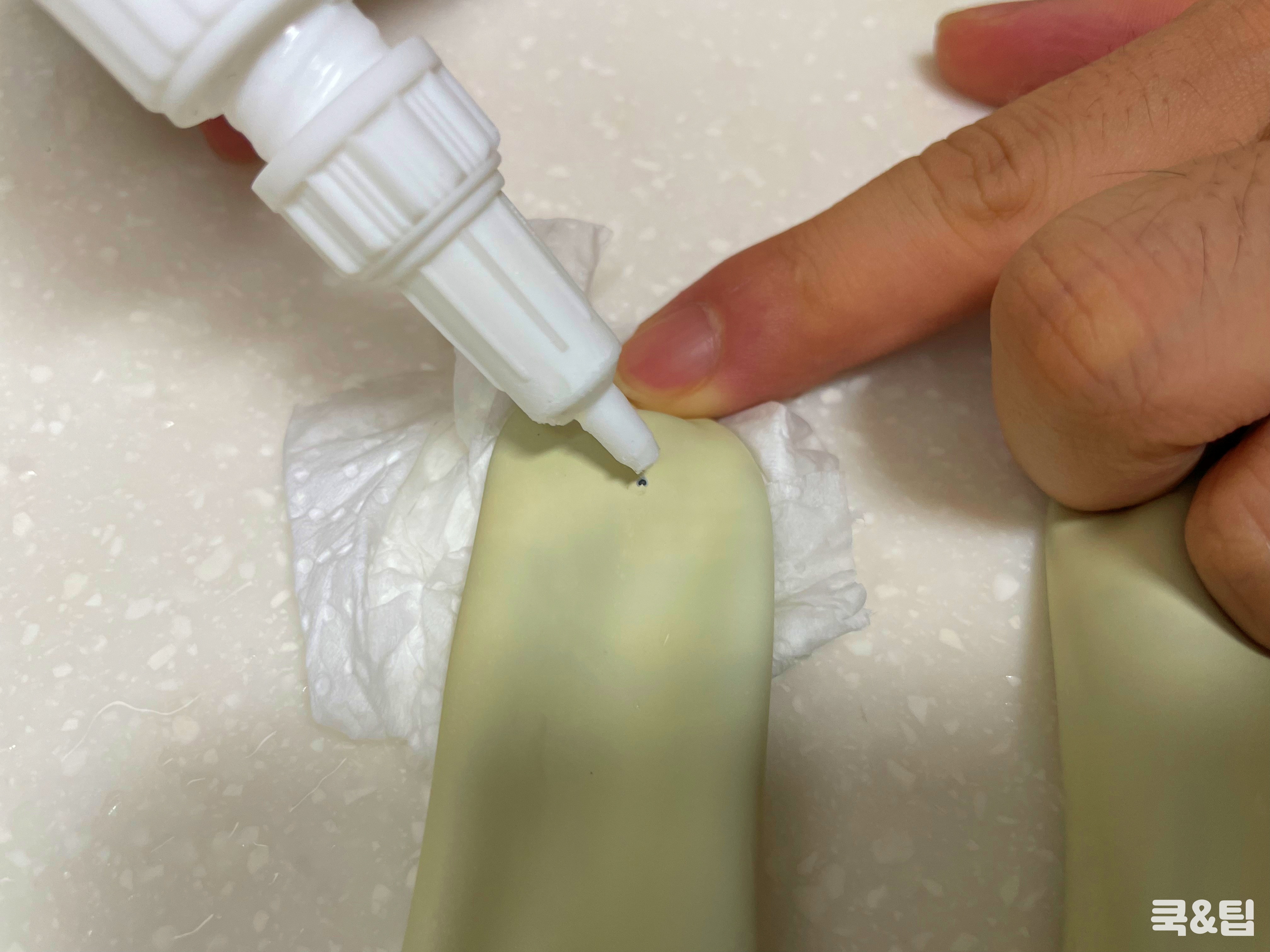 구멍 난 부위에 글루건을 쏘아주세요.
