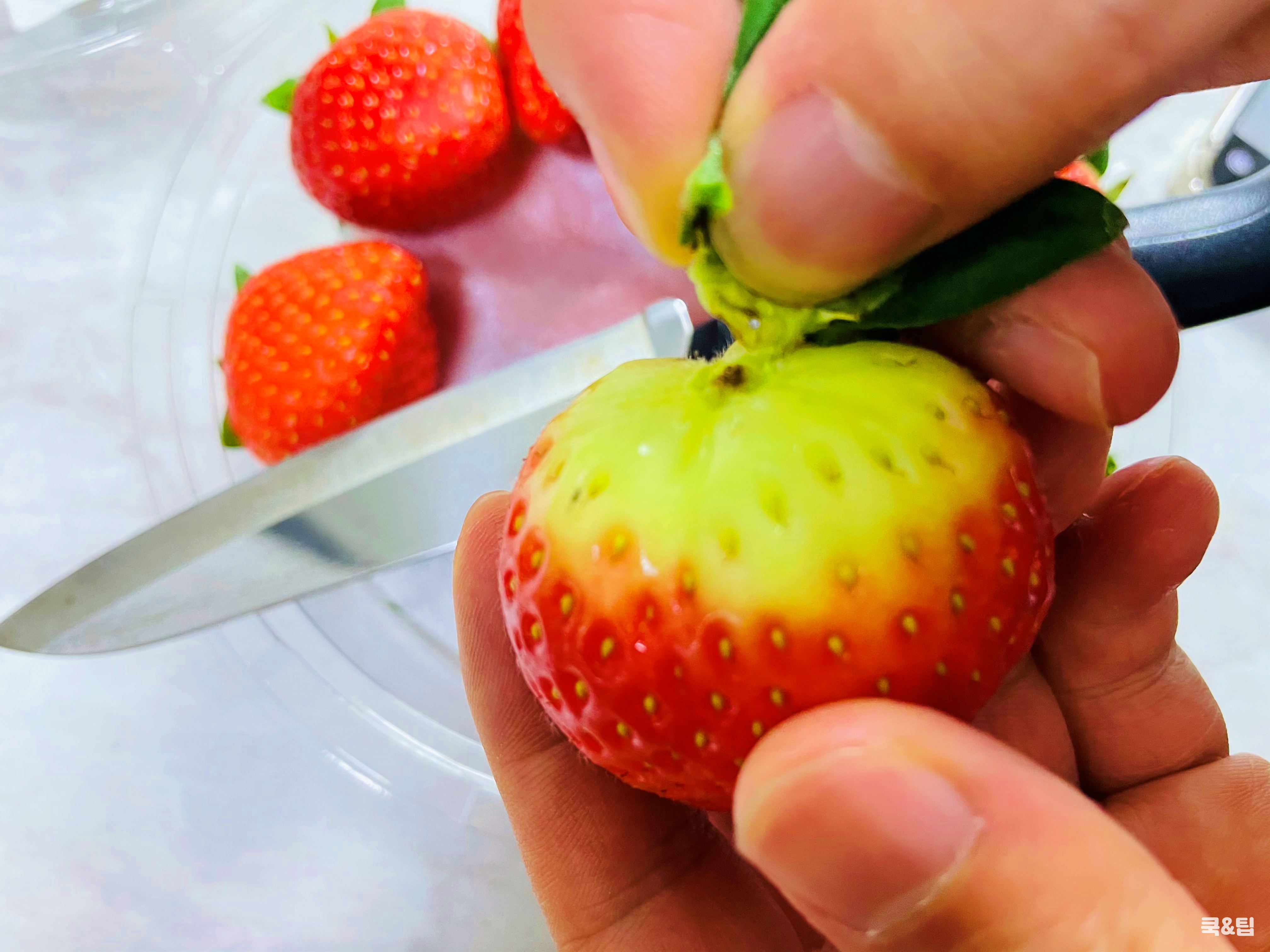 딸기의 꼭지를 따주세요.