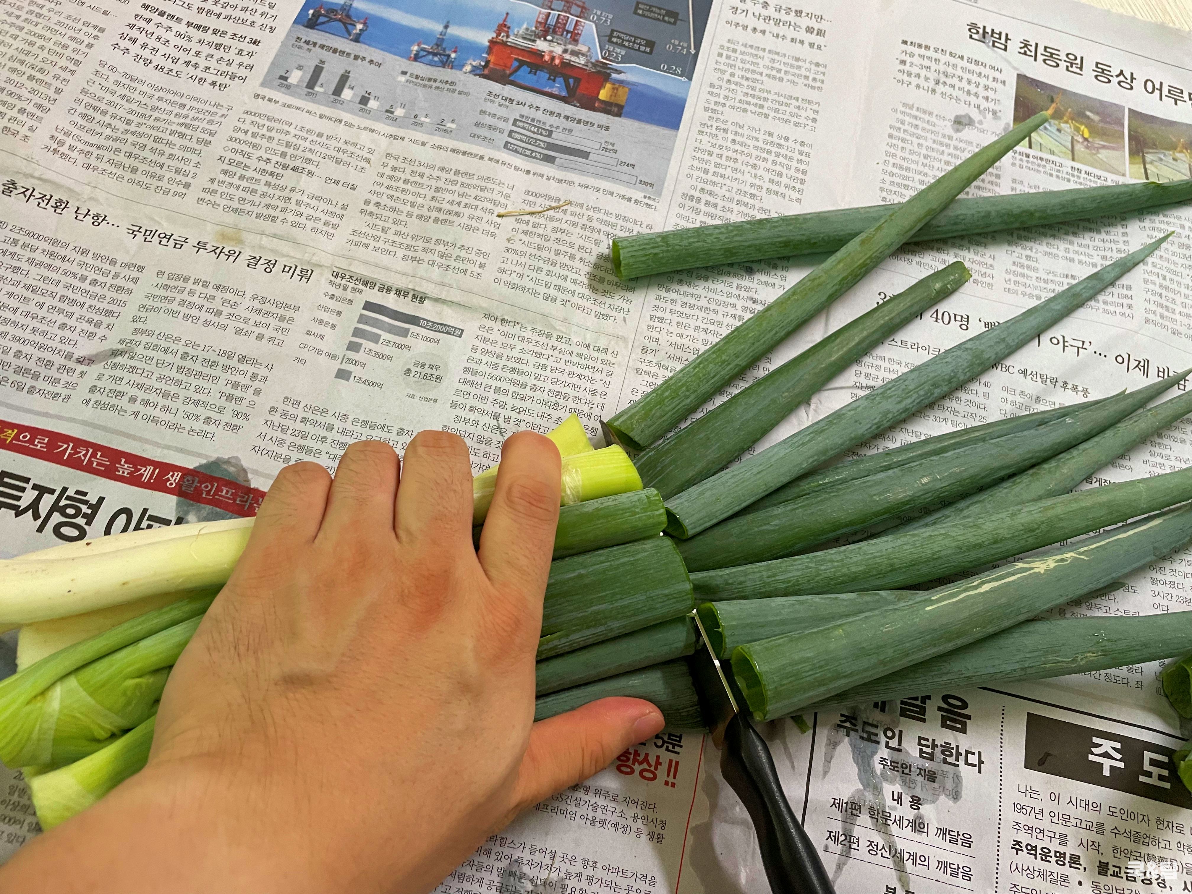 꽁꽁 언 대파 쪼개느라