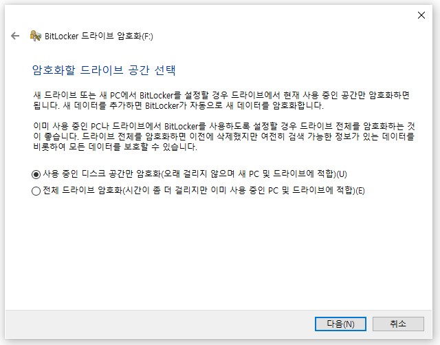 디스크 공간만 암호화 설정을 추천드려요.
